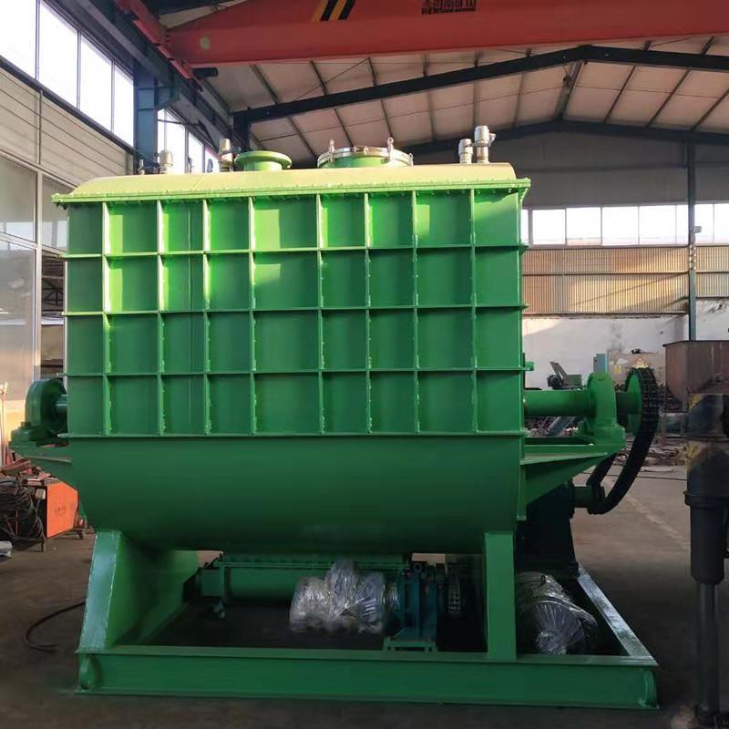 臥式螺帶混合機的傳動主軸上布置雙層螺旋葉片,內部螺旋將物料向外側輸送,外部螺旋將物料向內部聚集。物料在雙層螺旋帶的對流運動下,形成一個低動力高效的混合環引境。安裝于攪拌軸上的內外徑螺旋帶動桶體內物料,使攪拌器在桶體內放大范圍翻動物料。攪拌裝置工作時內螺旋帶動靠近軸心處物料做軸心旋轉,軸向由內至兩側推動,外螺旋帶動靠近桶壁物料做軸心旋轉,軸向由兩側至內推動,本混合物料能夠在較短時間內均勻混合。